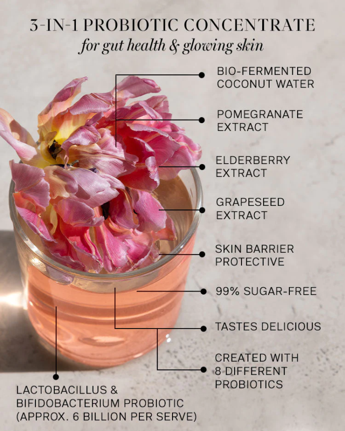 Microbiologist created and clinically formulated multi-action probiotics from eight broad-spectrum strains are fermented on coconut water to synergistically replenish the microbiome with diverse bacteria, while naturally occurring electrolytes, minerals, and antioxidants hydrate cells, restore cellular actions, and reduce bloating. Targeting the direct link between the health of the microbiome and the health of the skin, Beauty Renewal revitalises confident skin and radiant health from within.